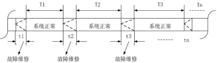 (1)可靠性,指某一時間段內設備或系統(tǒng)連續(xù)運行而無故障發(fā)生的概率。重要表征參數是平均無故障時間(Mean Time Between Failure,簡稱MTBF)是指相鄰兩次故障之間的平均工作時間,也稱平均故障間隔時間。如圖1所示MTBF= ,系統(tǒng)故障率λ= 1/MTBF。