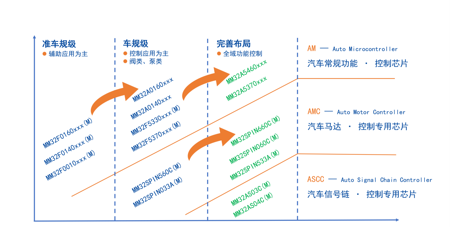 在芯片品類上,靈動微電子的汽車應用產品則可劃分為以MM32F、MM32A系列為代表的汽車常規功能控制芯片、專為汽車馬達應用打造的多個MM32SPIN系列控制專用芯片以及未來將推出的針對汽車信號鏈應用的控制專用芯片。